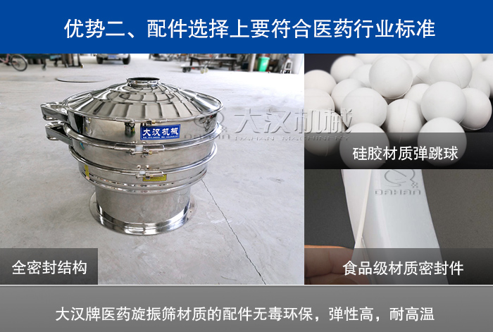 對于醫藥行業的旋振篩配件選擇上是需要特別謹慎的,大漢牌醫藥旋振篩在設備密封件,彈跳球選擇上需要選取優質的無污染硅膠材質,此類材質的配件更安全,彈性高,耐高溫,符合醫藥行業的衛生標準。