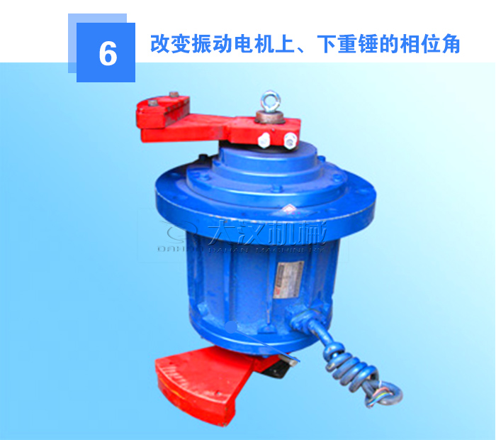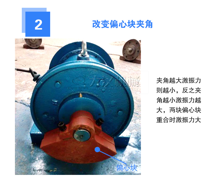 振動電機通過改變偏心塊夾角的大小來調(diào)節(jié)偏心塊,夾角越大激振力則越小,反之夾角越小激振力越大,兩塊偏心塊重合時激振力大。