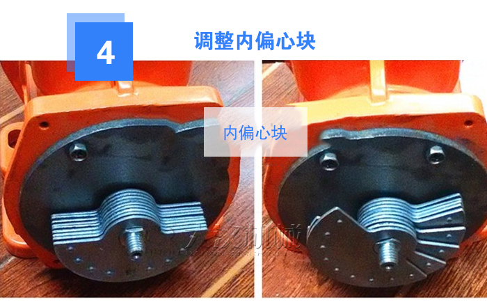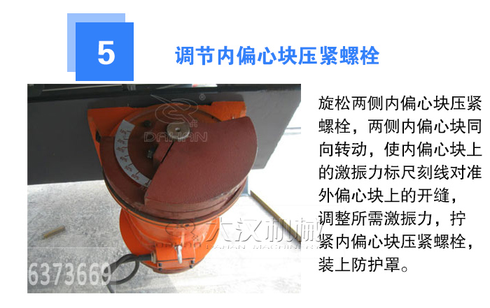 轉(zhuǎn)軸的兩端面上都刻有基準線,旋松兩側(cè)外偏心塊壓緊螺栓,兩側(cè)外偏心塊同向轉(zhuǎn)動,使軸上刻線對準外偏心塊上的激振力標尺刻線,調(diào)整所需激振力,擰緊外偏心塊壓緊螺栓,裝上振動電機的防護罩就可以了。