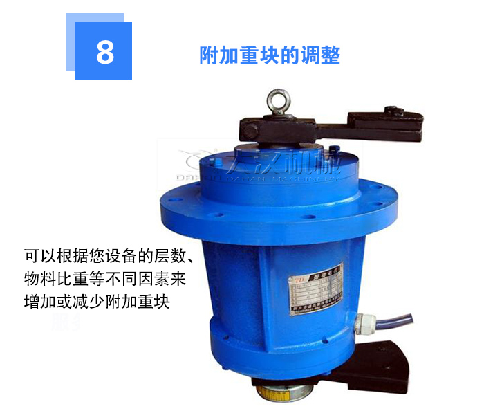 在上、下重錘的一側(cè)裝有附加重塊,它的作用是增減篩機的激振力。您可以根據(jù)您設備的層數(shù)、物料比重等不同因素來增加或減少附加重塊。