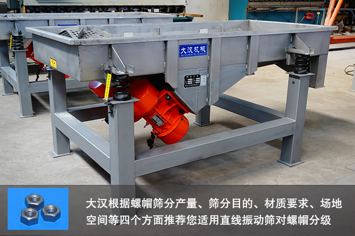 大漢根據螺帽篩分產量、篩分目的、材質要求、場地空間等四個方面推薦您適用直線振動篩對螺帽分級。